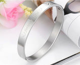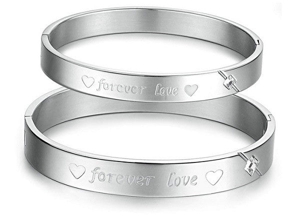 With a bond this strong, you’re bound for a forever kind of love. These matching couple’s bracelets are modern and minimalist with an all-over polished silver design. ‘forever love’ is engraved in a handwritten font, surrounded by two hearts. On the side, a diagonal accent celebrates a single square rhinestone.