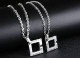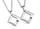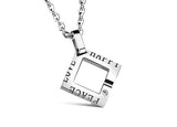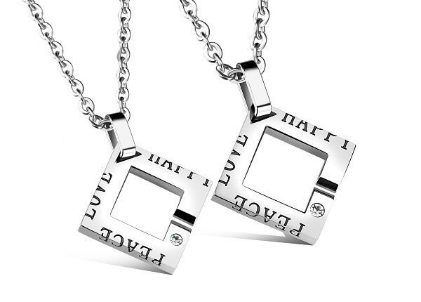 When you find the simple, easy love that just feels right, be sure to cherish it. These modern necklaces feature a square outline shape with a luxurious gem and an open passage on one side for love to enter. The words ‘Peace,’ ‘Love,’ and ‘Happy’ are inscribed with an easy-going, lighthearted design that wraps around the sides.
