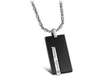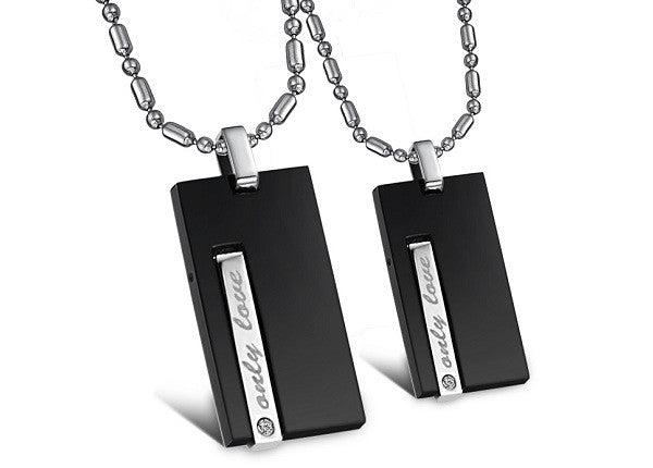 This sophisticated couple’s necklace set removes all of the frills and distractions, leaving only a reminder of the central thing in life that matters most. ‘Only love’ is engraved in a romantic font on a simple silver bar that stretches across the side of the matte black pendant. A small, shimmering rhinestone represents your love wherever you go.