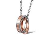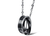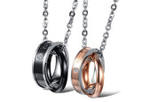This pair of couple necklaces features wrapping rings that hold tightly in a strong embrace. Capture the beauty of your unique bond with his and hers couple's necklaces. Crafted in black and rose gold metal, the rings feature a single small rhinestone for a touch of sparkle, and ‘The only eternal love’ is inscribed as an enduring promise.
