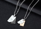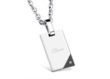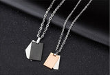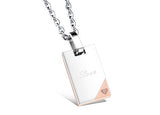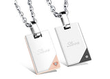 The Our Fairy Tale Ending couple’s necklaces represent the beautiful, sparkling cover of a classic love story. The set includes a rose gold and black block pendant, each accentuated with a simple rhinestone in the corner. A polished silver top piece is inscribed with the word ‘Love’ and shows only a peek of what’s underneath with an open corner.
