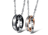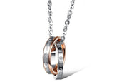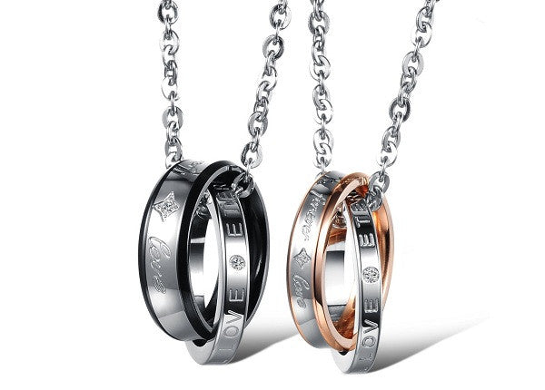Meeting the person whom you've decided to spend forever with is a once-in-a-lifetime moment. Celebrate your intimate bond and fidelity with a pair of couple's necklaces that feature the inscription 'forever love' in cursive font. The main ring has delicate rhinestone detailing on a central silver strip between the black or rose gold edges while a closely interlocked silver ring holds tightly with the words ‘Eternal Love.’