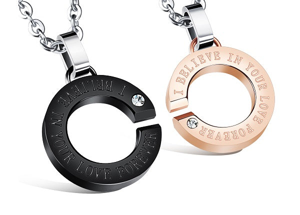 At some point in your journey together, you have to take a leap of faith and cross the divide, putting your trust in your confidante and partner. The Thank You for Trusting Me necklace set demonstrates this moment of doubt, trust, and perseverance beautifully with an interrupted circle shape that is inscribed with the phrase ‘I believe in your love forever’.